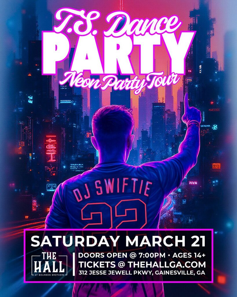 Calling all Swifties! 💖🌈 Get ready to dance through all 12 eras at the T.S. Dance Party: Neon Party Tour 2026! 🎧 DJ Swiftie will be spinning your favorite Taylor hits all night long, with nonstop dancing and plenty of friendship bracelets. Grab your friends, dress in your favorite era, and get your tickets before it's too late 💫